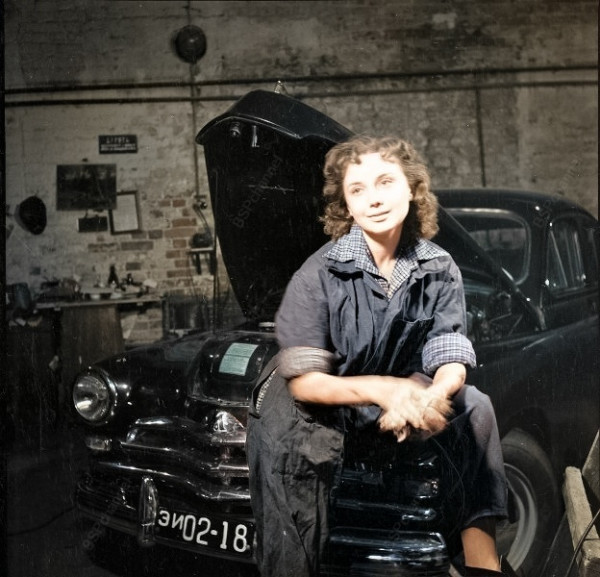 Артистка театра и кино Елена Добронравова в автомастерской, март 1957 года.