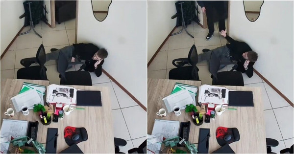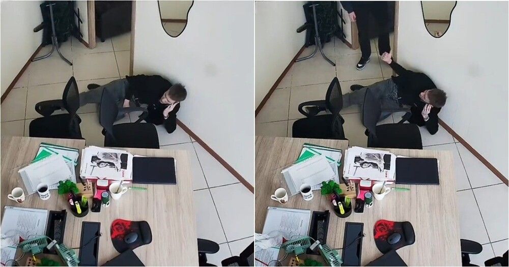 В офисе произошёл неожиданный инцидент: молодой сотрудник шёл по плитке и поскользнулся, рухнув на пол. Но вместо паники он продолжил разговор с клиентом по телефону, лёжа на полу, будто ничего не случилось. Настоящий пример стрессоустойчивости и спокойствия в любой ситуации!