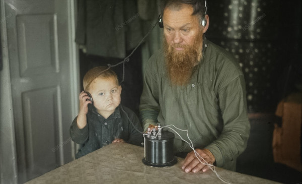 Дед и внук слушают радио. Ныне Свердловская область, 1920-е.