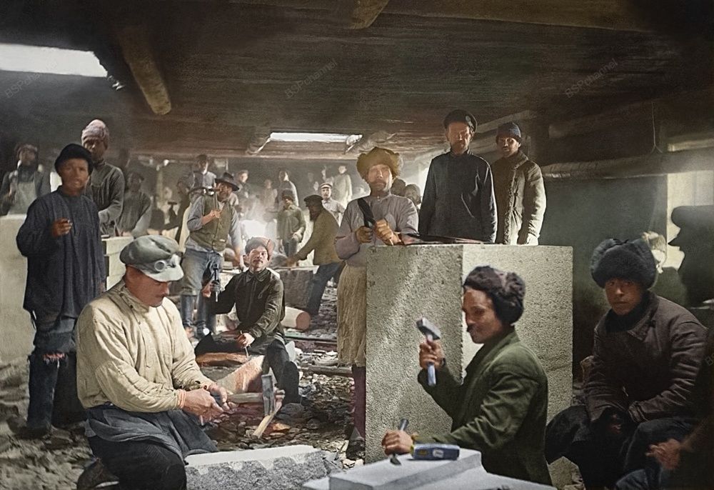 Строительство памятника Владимиру Ленину на Алом поле. Каменотесы за работой. Челябинск, 1925 год.