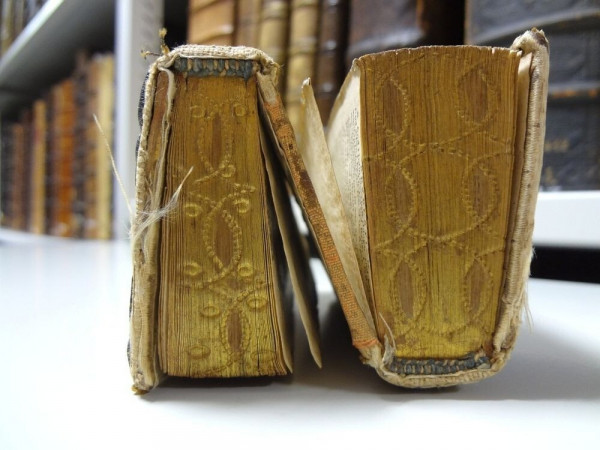 У этого переплёта весьма необычная конструкция. Две книги скреплены таким образом, что передний обрез одной примыкает к корешку другой, а обе они имеют общую заднюю крышку, зажатую между ними. Если поставить такой фолиант на полку, корешок одной книги будет смотреть наружу, а корешок другой внутрь, к стенке шкафа. Этот причудливый стиль переплёта называется "dos-à-dos" (ду-а-ду) - французское выражение, означающее "спина к спине".