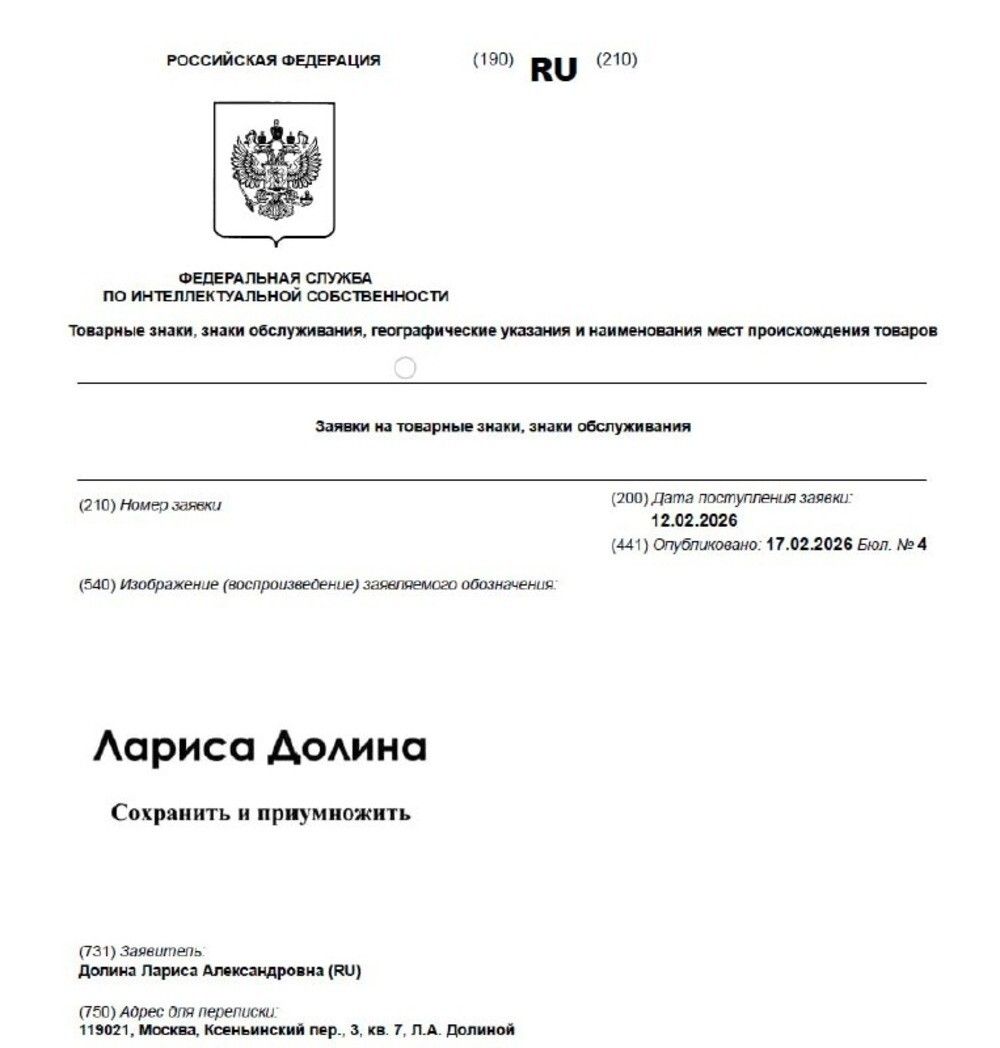 В Роспатент подали заявку на регистрацию товарного знака "Лариса Долина. Сохранить и приумножить". Ранее СМИ писали, что заявку подала сама народная артистка, однако сегодня стало известно, что неизвестные шутники сделали это от её имени, указав в адресе для переписки с ведомством дом в Ксеньинском переулке в Москве, где расположена злосчастная квартира, проданная артисткой под влиянием мошенников.В документах говорится, что товарный знак планируется использовать для ведения связанного с недвижимостью бизнеса, оказания консультационных услуг при задолженности и подготовки юридических документов