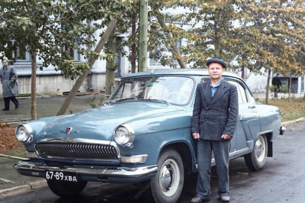 "Волга" и её хозяин у дома с аптекой на ул. Калинина в День защиты детей, 1963 год.