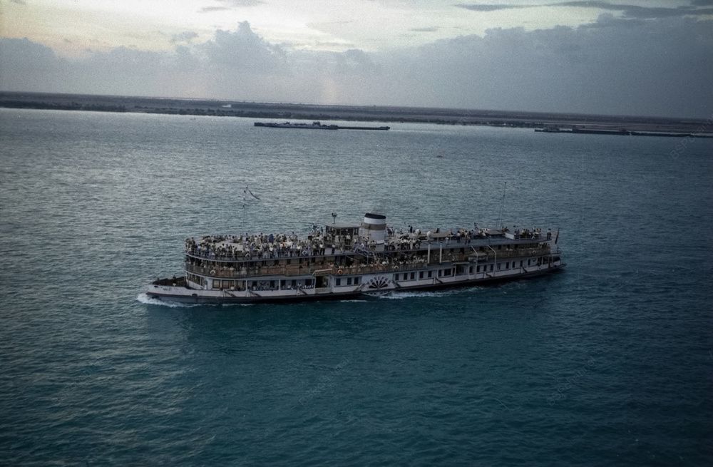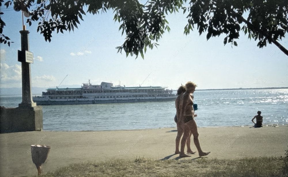 Теплоход "Семён Дежнёв" подходит к дебаркадеру напротив пляжа, 1965 год.