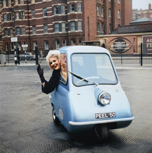 Модель Карен Берч за рулем Peel P50, нового микроавтомобиля, произведенного компанией Manx Peel Engineering Company, перед выставочным центром Earl's Court перед началом мотоциклетной выставки в Лондоне, 8 ноября 1962 года.