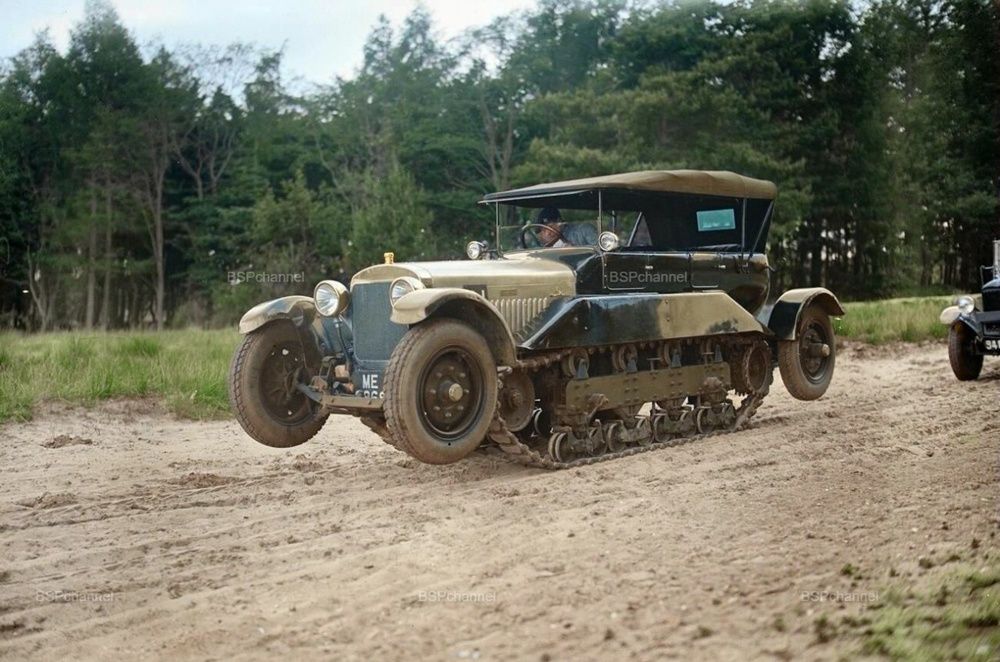 Участники конференции Колониального управления наблюдают за демонстрацией транспортных средств повышенной проходимости в Олдершоте, проводимой Военным управлением. При движении по обычной дороге гусеницы автомобиля поднимались.