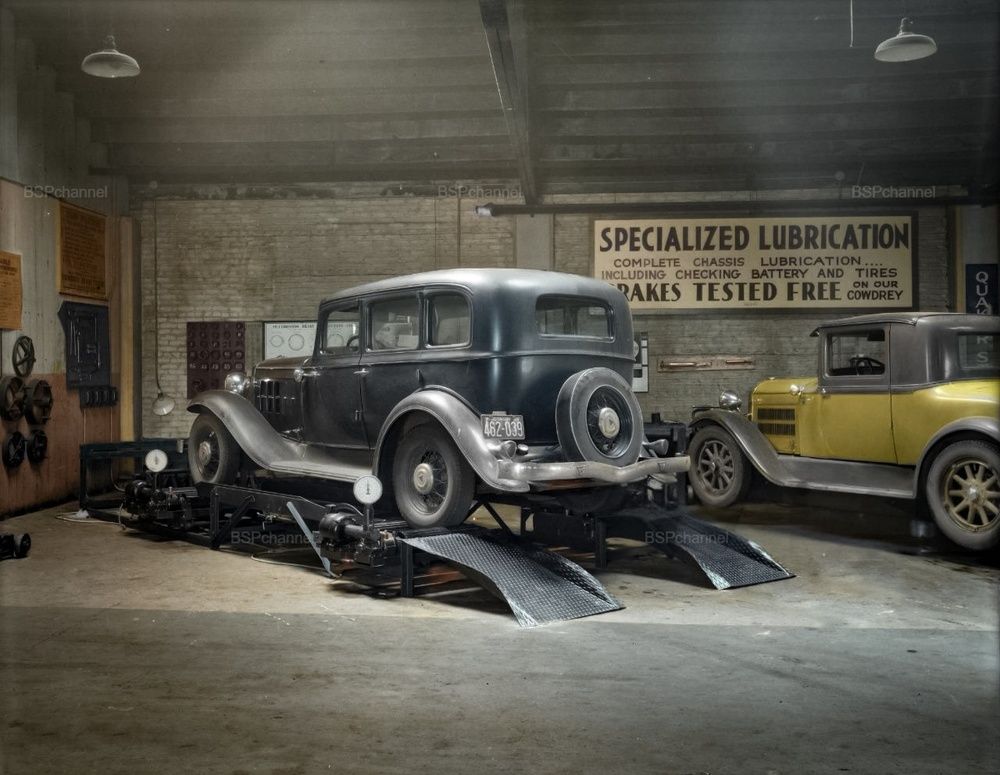 Автомобиль в ремонтной мастерской. США, 1950-е.