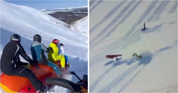 В Якутии четверо друзей испытали настоящий экстремальный момент во время спуска с горы на надувном "банане". По словам самих участников, посреди склона "банан" начал неуправляемо вилять, разбрасывая ребят на десятки метров друг от друга.