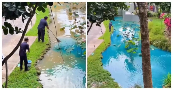 В декоративных водоёмах на азиатских курортах, где мутная вода может испортить всю картину, часто прибегают к окрашиванию, чтобы вода выглядела чище и привлекательнее. Для этого используют специальные нетоксичные красители для прудов - они абсолютно безопасны как для рыб, так и для растений.