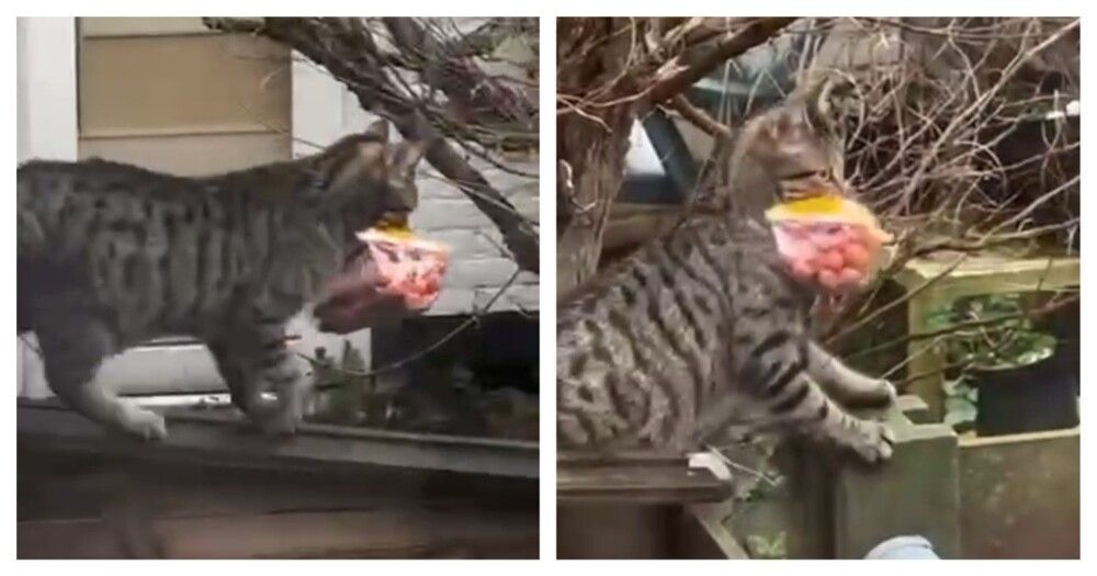 На видео попала кошка, которая явно преуспела в своей "охоте". В зубах животного была добыча в виде упаковки сосисок.
