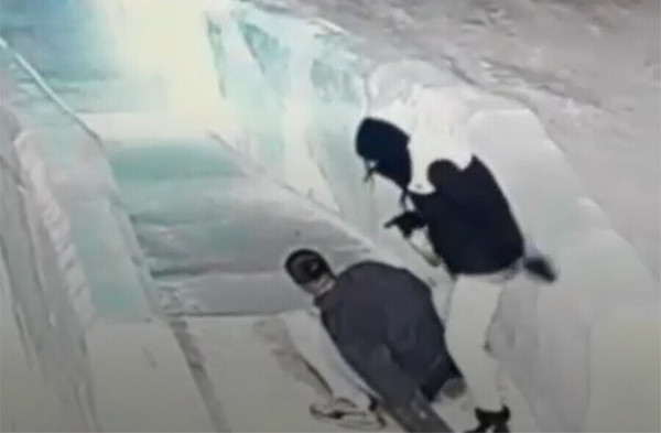 Молодой человек с девушкой решили к уже выпитому добавить еще адреналин. Пара поднялась на ледяную горку. Девушка сначала столкнула друга, а потом бросила бутылку, которую держала в руках и которая, конечно, разбилась.
