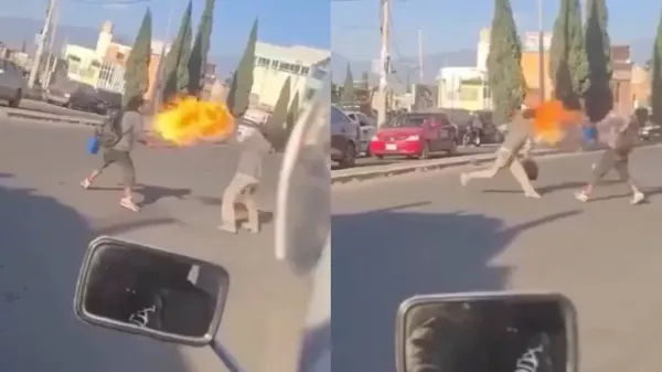 Конфликт на улице едва не перерос в опасную разборку, когда один из участников начал пускать огонь, удерживая противника на расстоянии. Драка превратилась в зрелище, которое могло легко закончиться обожжёнными бровями и ресницами.